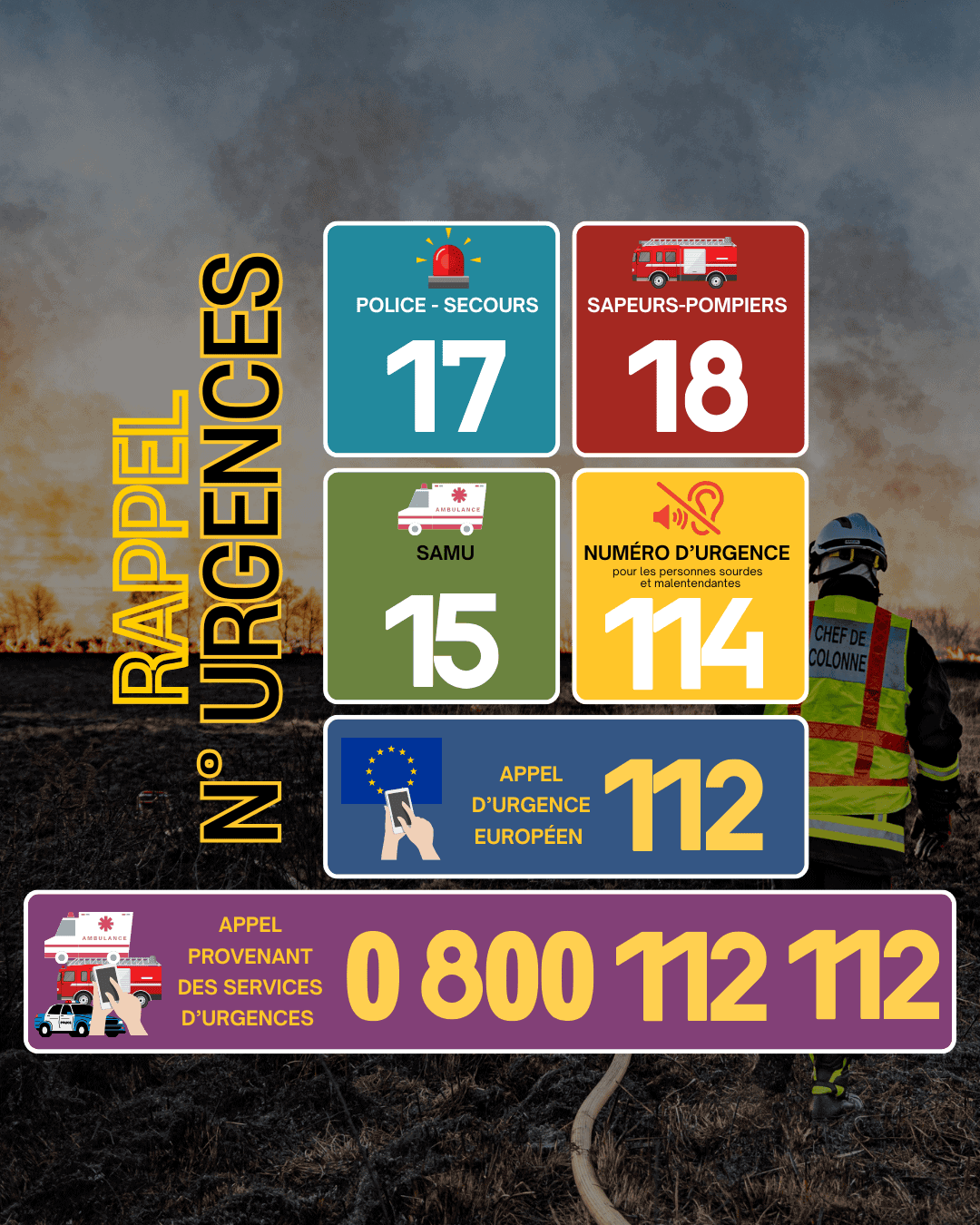 0 800 112 112 – numéro de rappel des services d’urgence : depuis le 1ᵉʳ octobre 2024, les services d’urgence (17, 18, 112, 15) utilisent ce numéro unique, le 0 800 112 112, pour rappeler les personnes ayant contacté les secours.